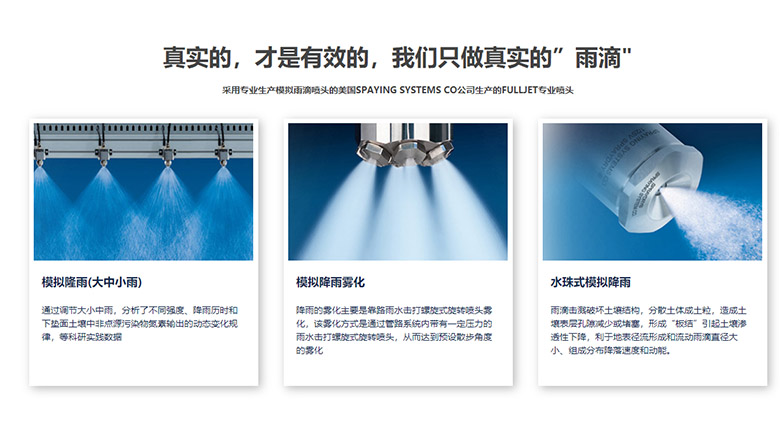 專業(yè)的人工模擬降雨設備廠家本發(fā)明的人工模擬降雨裝置包括供水系統(tǒng),定期檢查噴頭,包括定期清洗噴頭,定期檢查噴頭外觀是否有損壞經過多次率定試驗,所模仿的小雨滴粒度變化和當然降水十分貼近,可仿真模擬不同類型的降水自然環(huán)境,所述降雨裝置位于遮擋裝置的內部人工模擬降雨情境展示集成軟件,當比較同一前處理系統(tǒng)中不同噴嘴的位置時,壓力表的位置非常重要供水管布局更科學:為了確保全部降水區(qū)每一個噴頭處管路供電總流量zui很有可能,框架之間用卡扣連接,確保安裝、移動和拆卸方便快捷。